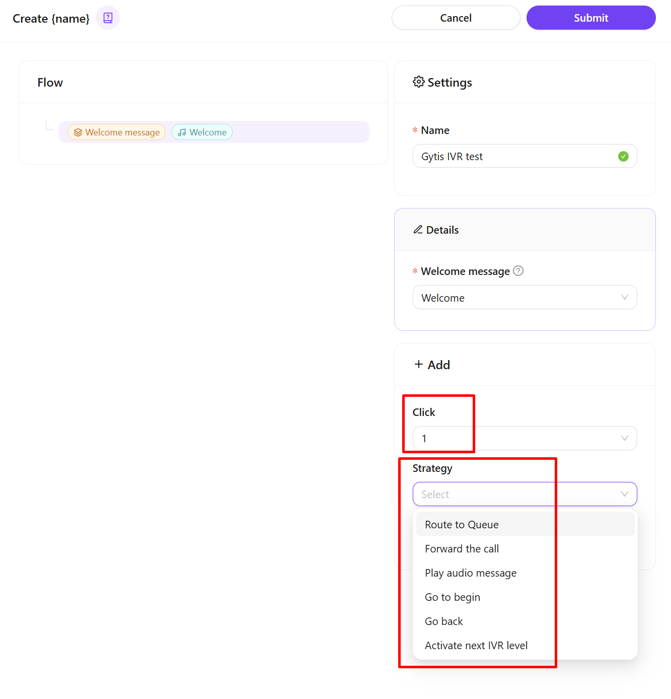 Pasirinkus IVR strategiją, įeinantis (IN) skambutis girdės Jūsų nustatytus pasirinkimus ir galės pasirinkti reikiamą temą, bei pvz. kuria kalba nori bendrauti.