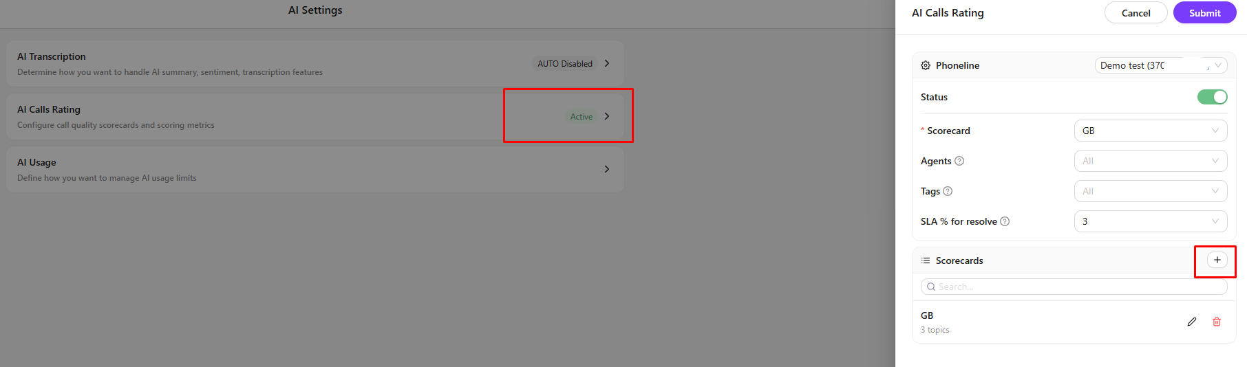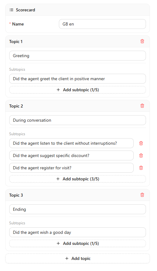 • If you want not only a transcription but also a full call evaluation, first create your desired questions and Scorecard: