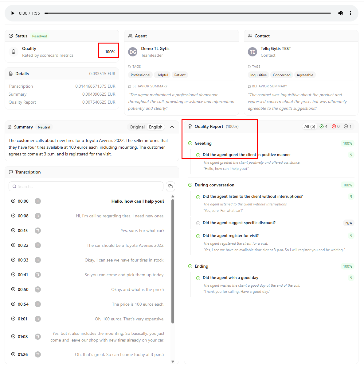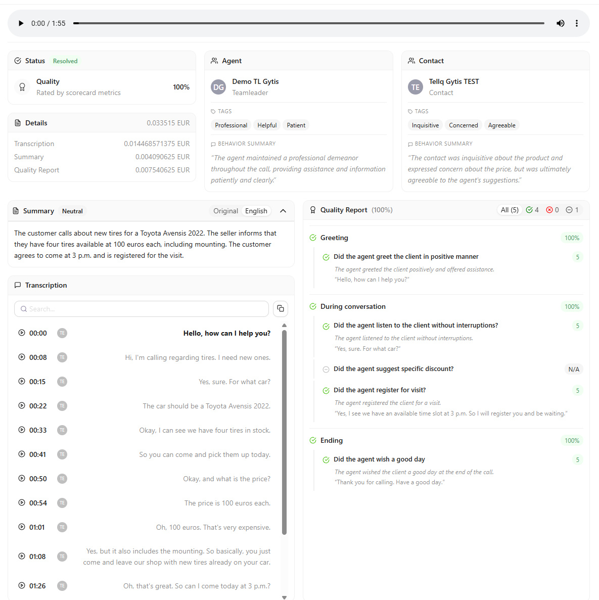After the call, you will see a complete call overview: both the transcription and the call evaluation based on your criteria: