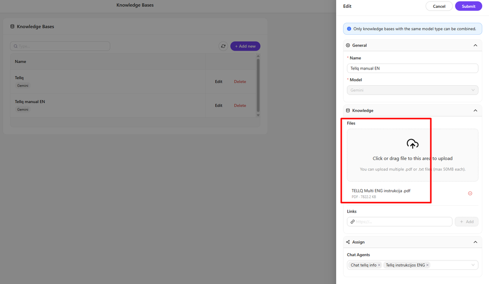 In the TL >> Settings section, upload the information you want to include — you can add both PDF files and links to your web pages.