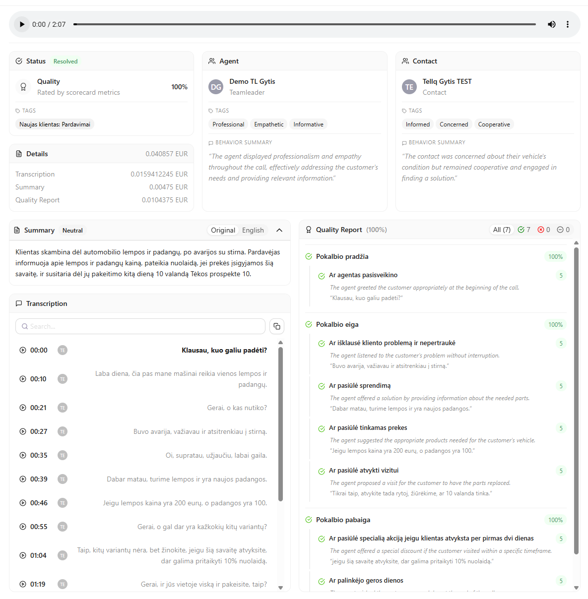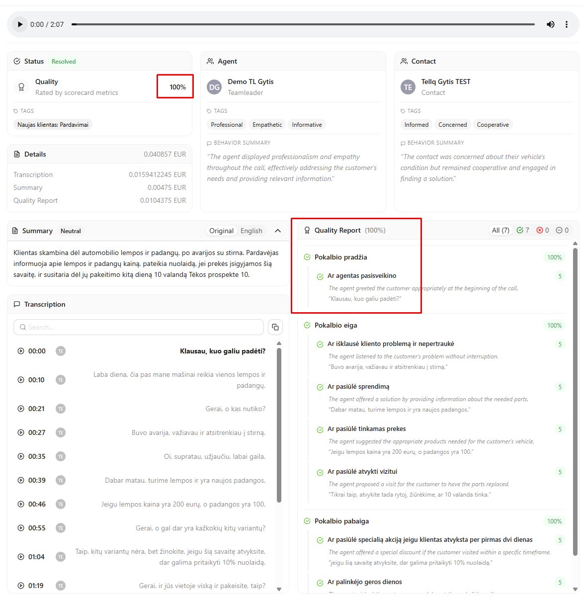 Po skambučio matysite pilną pokalbio vaizdą: tiek transkripciją, tiek skambučio įvertinimą pagal Jūsų kriterijus: