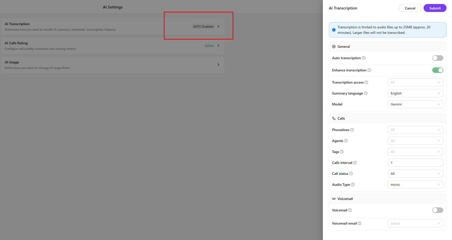 galite parinkti kokius skambučius transkribuoti automatiškai.